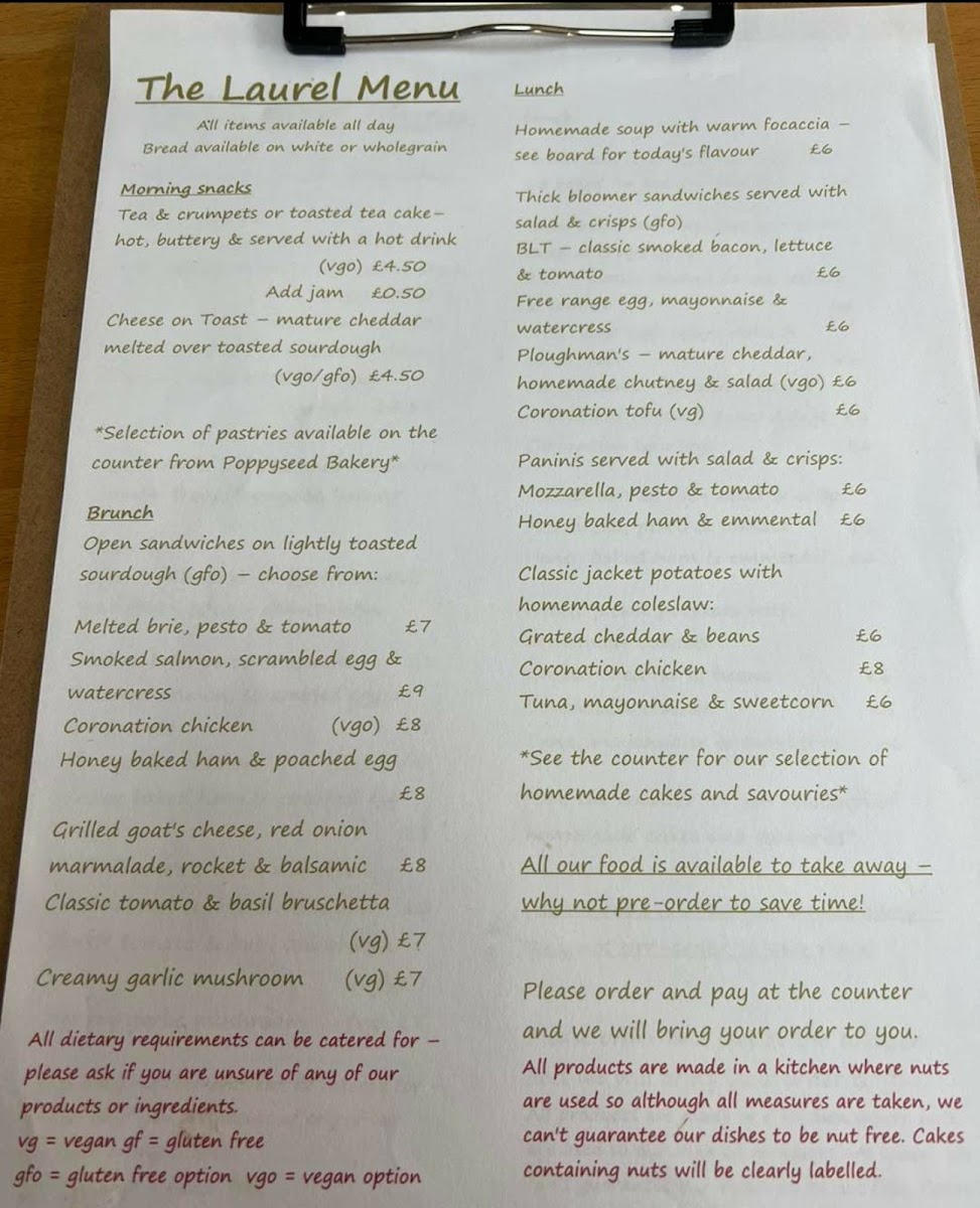 The menu at The Laurel offers a variety of options suitable for breakfast, light meals, and casual dining throughout the day. It features a selection of breakfast items including scrambled eggs on toast, a veggie breakfast, and a cooked breakfast. For midday or lighter meals, the menu includes today’s specials such as a ham & cheese croissant served with salad and a club sandwich. Additional choices include classic tomato & basil bruschetta and creamy garlic mushrooms.